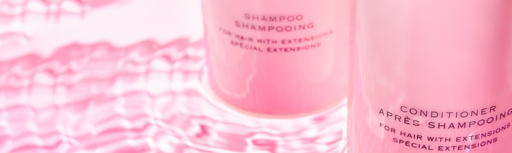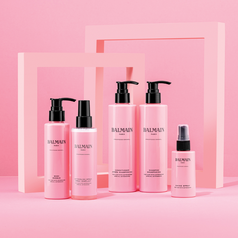 Полный ассортимент продуктов для ухода за наращенными волосами.